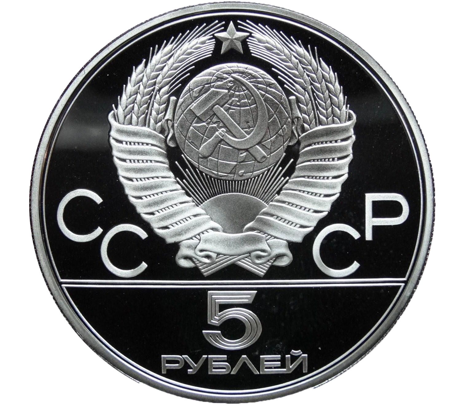 Аверс: рельефный герб СССР в центре, окруженный буквами «СССР». Ниже указан номинал монеты «5 рублей». Реверс: изображение спортсмена-бегуна на фоне легендарного московского стадиона «Лужники».