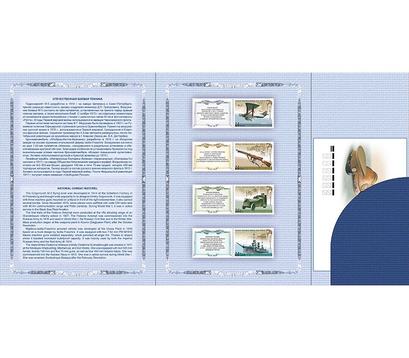 Сувенирный набор в художественной обложке «История Первой мировой войны. Отечественная боевая техника». Набор выпущен в 2016 году. Обложка трехстворчатая, размер в сложенном виде: 190×260 мм. Внутри обложки — четыре почтовые марки с купонами, конверты первого дня с гашением.