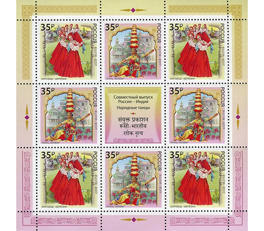 Лист с марками «Совместный выпуск Российской Федерации и Республики Индия. Народные танцы» Россия, 2017