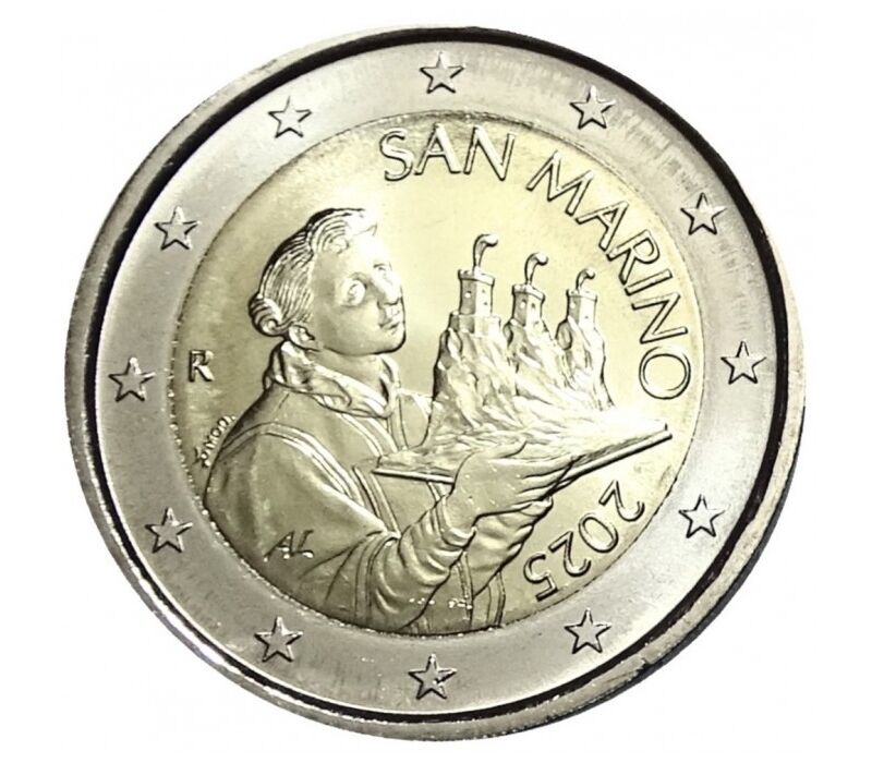 Биметаллическая монета Сан-Марино номиналом 2 евро третьей серии, впервые отчеканенная в 2017 году. В центральной части национальной стороны монеты изображен Святой Марино, держащий Три башни. Изображение взято с картины Джованни Баттисты Урбинелли.