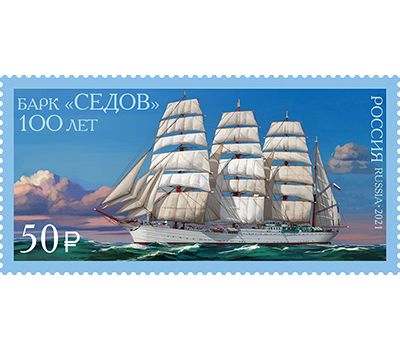 На почтовой марке изображено самое большое в мире учебное парусное судно, участник и победитель международных регат, мировой рекордсмен по скорости для парусников этого класса — барк «Седов».